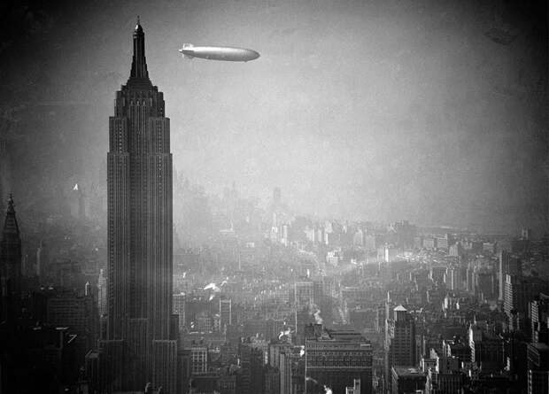 Немецкий цеппелин Гинденбург проплывает мимо Эмпайр-стейт-билдинг над Манхэттеном 8 августа 1936 года по пути к Лейкхерсту, Нью-Джерси, из Германии