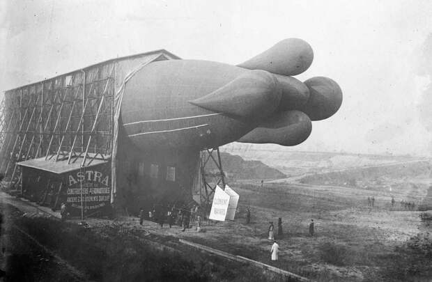 Дирижабль Клемент-Байяра в сарае, Франция, приблизительно 1908 год. Лопасти на хвосте, предназначенные для стабильности, были удалены в более поздних моделях, поскольку они, как выяснилось, замедляли скорость в воздухе.