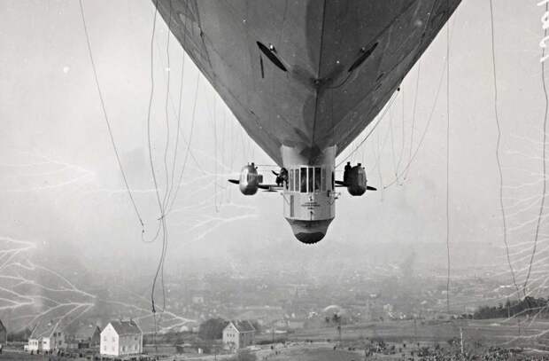 Управляемый «Лос-Анджелес» американского военно-морского флота, перевёрнутый вверх ногами после сильного ветра из Атлантики, 213-метровый дирижабль на собственном носу в Лейкхерсте, Нью-Джерси, 1926 год. Судно медленно вернулось в исходное положение, не причинив никаких серьёзных травм команде из 25 человек.