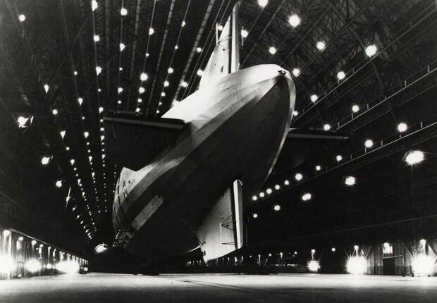 Построенный немцами цеппелин «Гинденбург» закатывают в ангар американских военно-морских сил, его нос прицеплен к мобильной башне швартовки, Лейкхерст, Нью-Джерси, 9 мая 1936 года. Жёсткий дирижабль только что установил рекорд своим первым пересечением Атлантики, первыми десятью запланированными путешествиями туда и обратно между Германией и Америкой.
