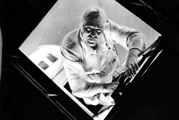 Механик в корпусе гондолы с задним расположением двигателя в мантии дирижабля во время путешествия Graf Zeppelin по Атлантическому океану в семидневной поездке из Европы в Южную Америку, август 1933года