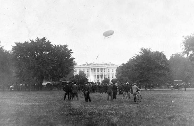Дирижабль летит над Белым домом в Вашингтоне, округ Колумбия, 1906 год