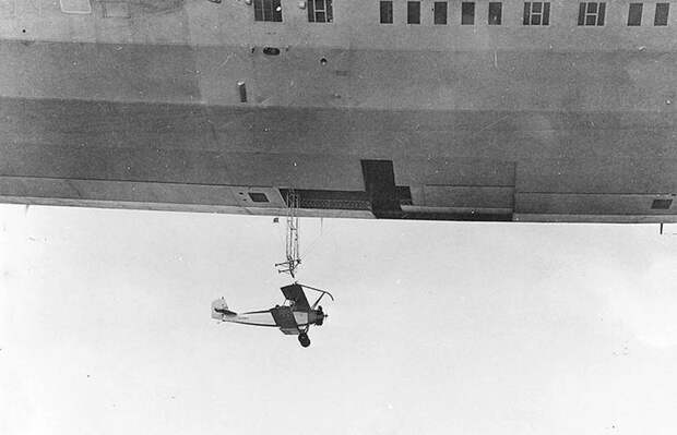 Военный дирижабль США «Акрон» запускает учебный самолёт N2Y-1 во время лётных испытаний около военно-морского аэродрома в Лейкхерсте, Нью-Джерси, 4 мая 1932 года