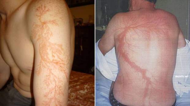 Например маленькая девочка, стоявшая у окна во время грозы. Она была поражена молнией. На ее теле отпечаталось изображение тополя во дворе. Или случай с матросом, убитым молнией. На его теле нашли изображение подковы, висевшей на мачте корабля как символ счастья.